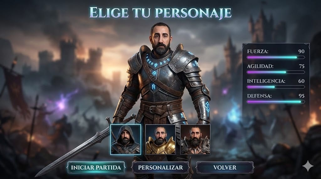 El Personaje: La persona de la imagen adjunta es el personaje principal, de pie en el centro de la pantalla, en una pose neutral pero lista para la acción. Viste una armadura épica. La representación del rostro y cuerpo del personaje debe ser muy fiel a la imagen adjunta, pero con la estética de un modelo 3D de videojuego hiperrealista.