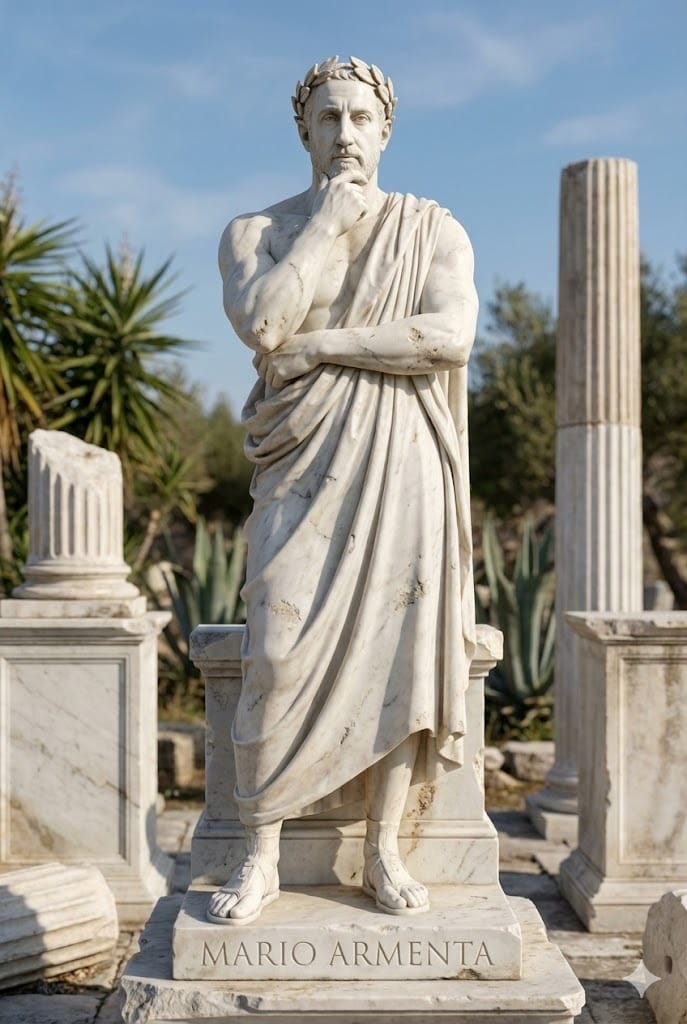 La persona está esculpida en una pose heroica o filosófica, como si fuera una deidad o un pensador antiguo. Los detalles de la piedra son muy realistas, con vetas y textura de mármol pulido, y zonas ligeramente erosionadas por el tiempo. La iluminación es suave y cenital, natural, creando sombras profundas y realzando los volúmenes de la escultura. El fondo es una ruina clásica, con pedestales de mármol a la vista. El nombre [NOMBRE] está grabado en la base. Imagen en formato vertical.OpenAI